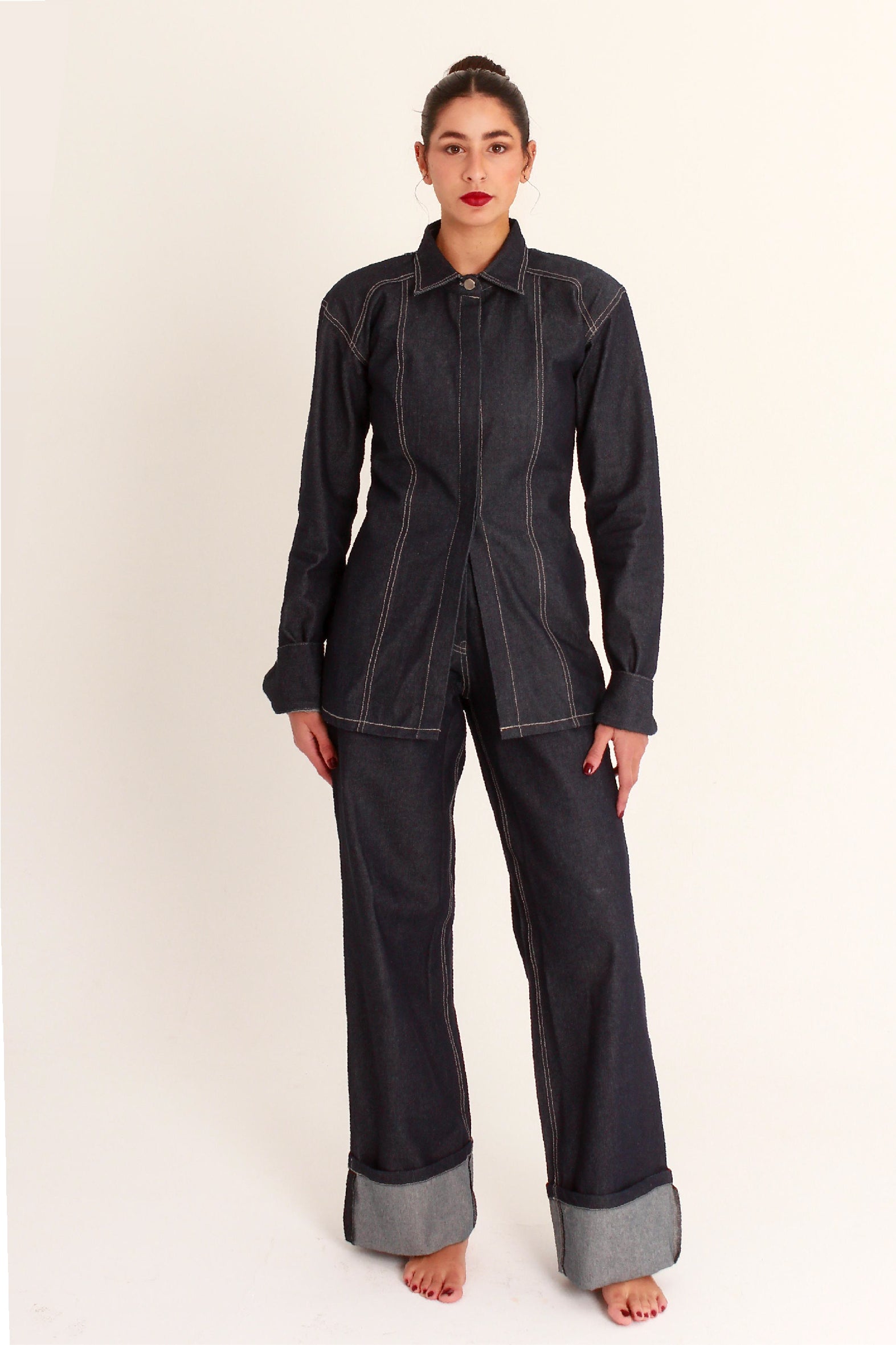 Beige fine stitched hour glass dark wash denim jacket, clear small hidden buttons with shown silver stainless steal button detail. Jeans tough material, follow care instructions carefully.