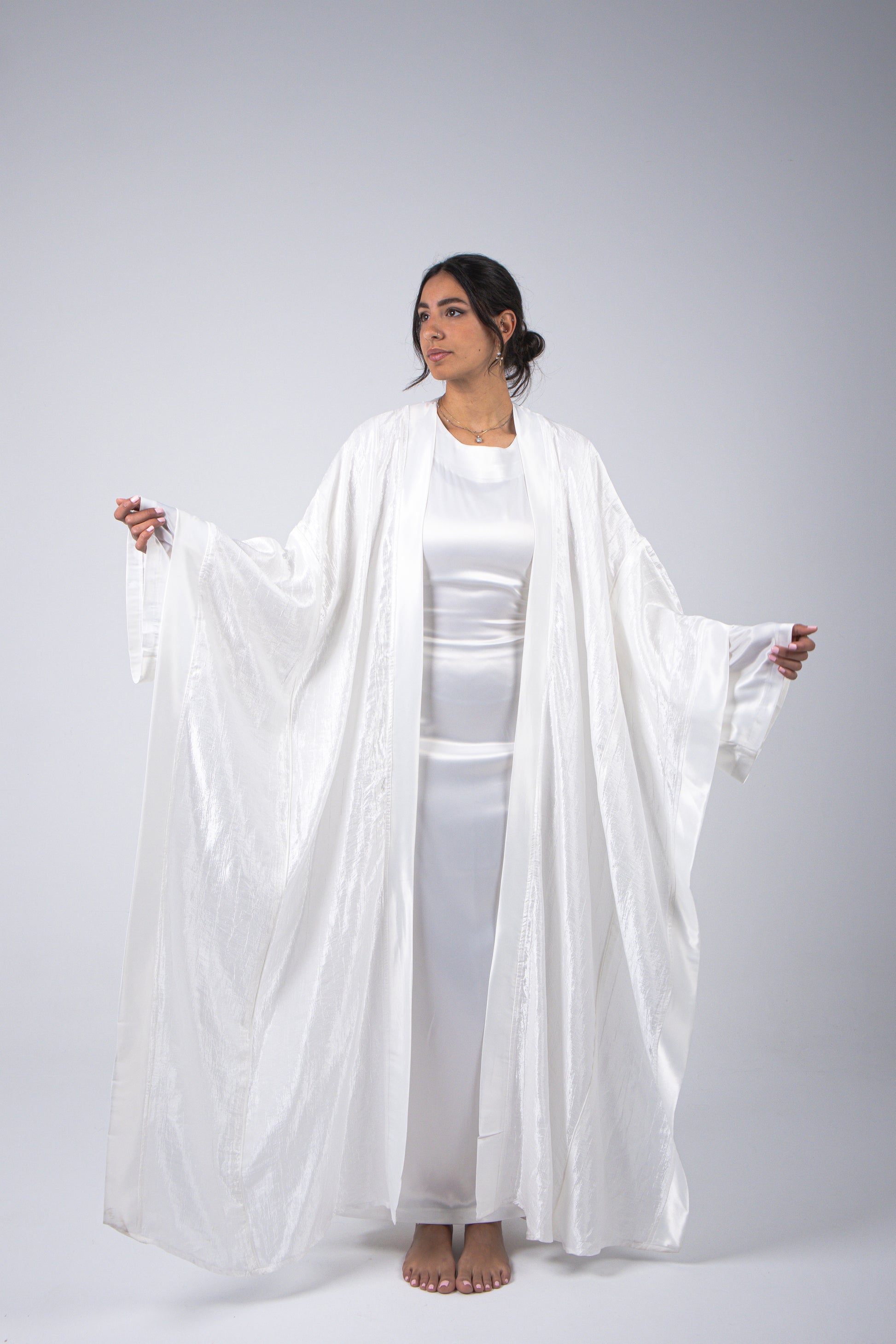 White, slightly shinny kaftan featuring a flowy silhouette draping over the body with satin boarders and thin lined detaining design. Open from both sleeves, worn like a poncho, can add a belt for extra styling.