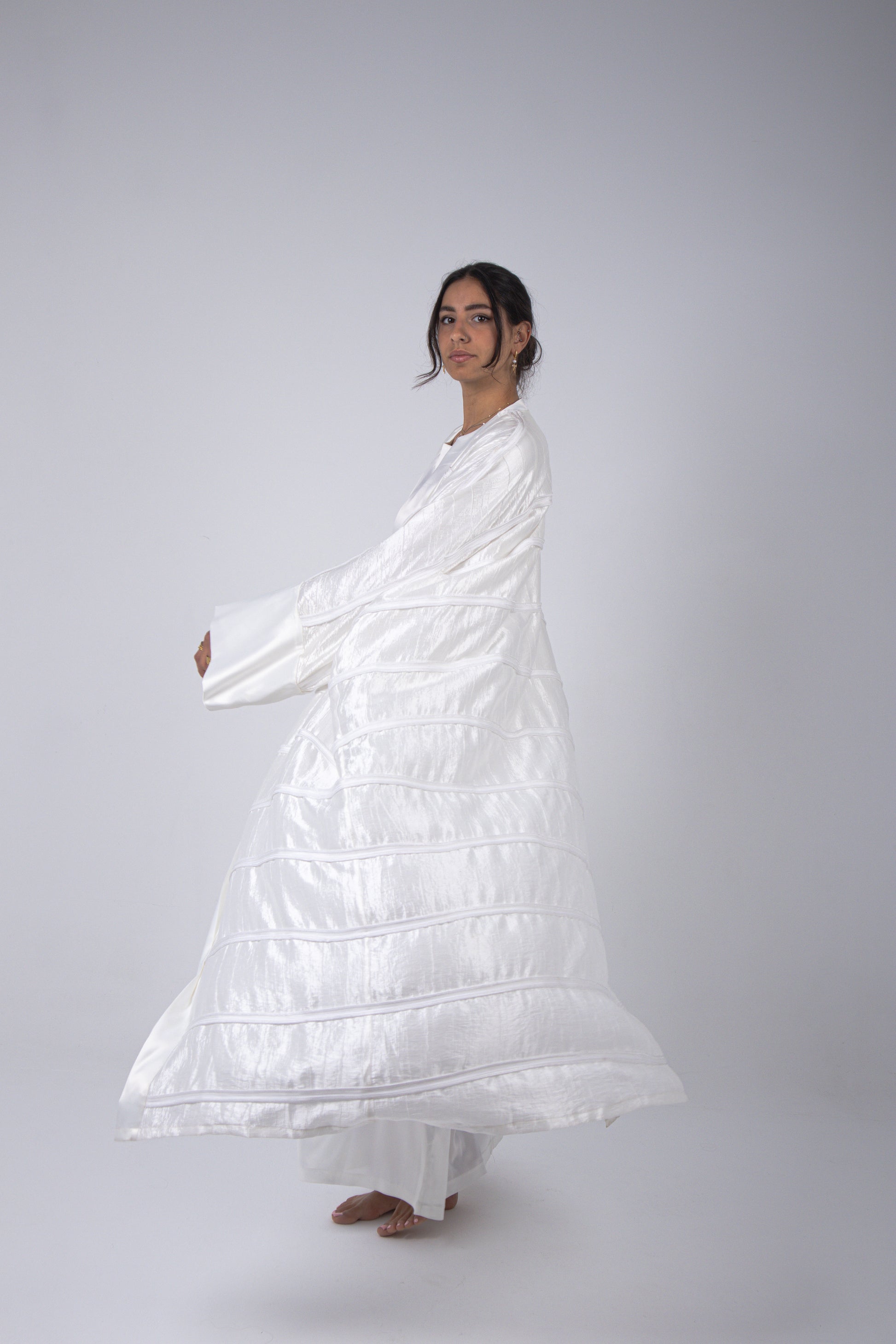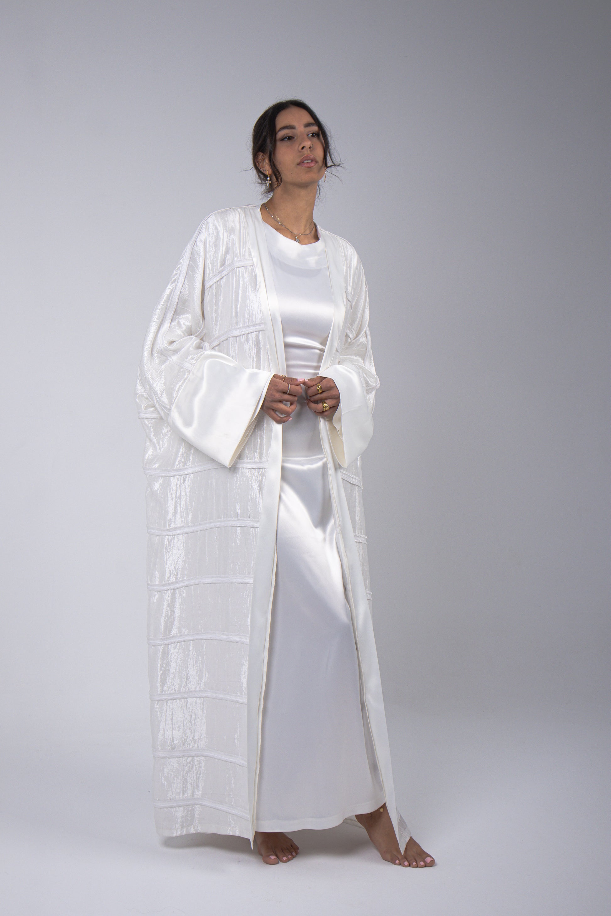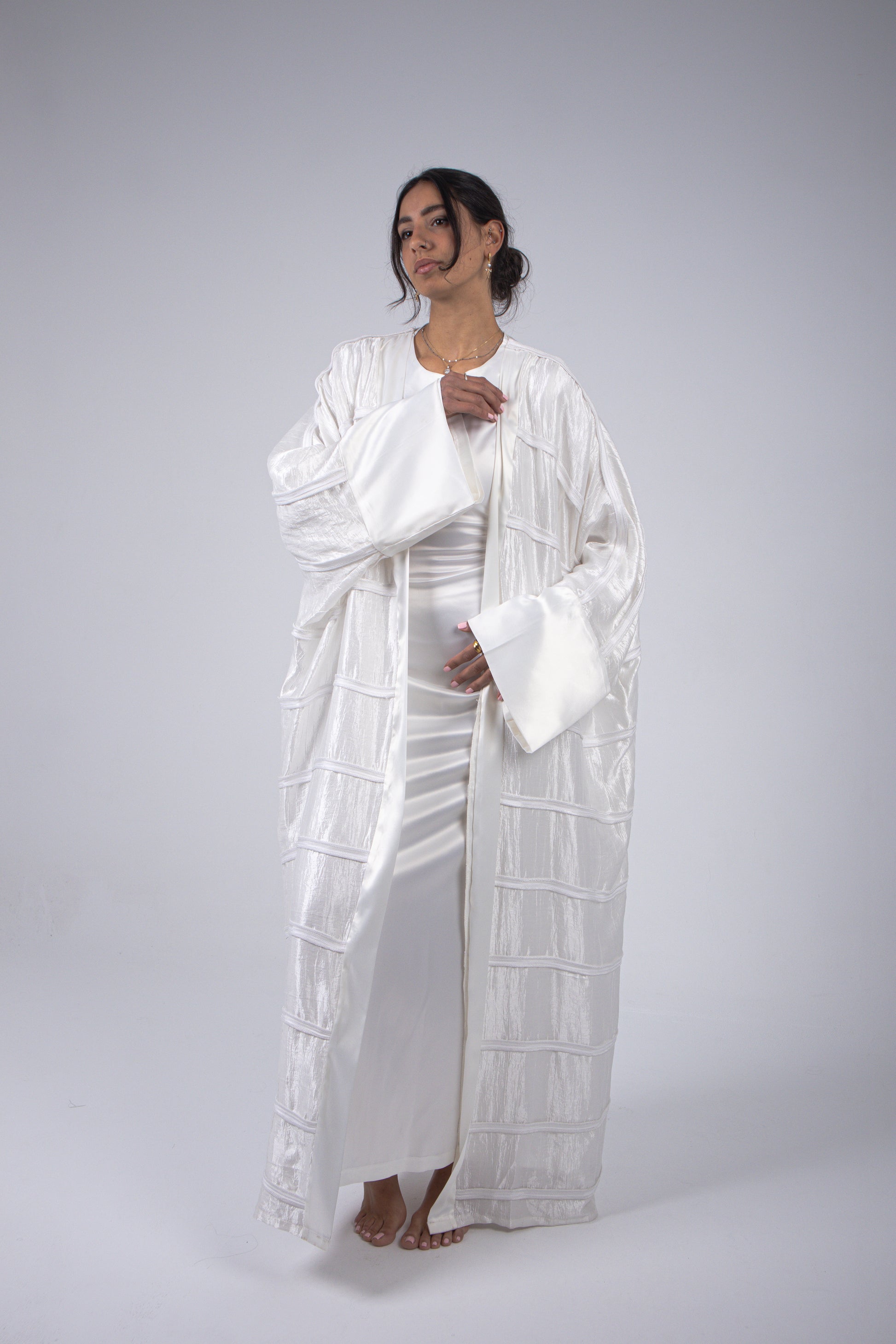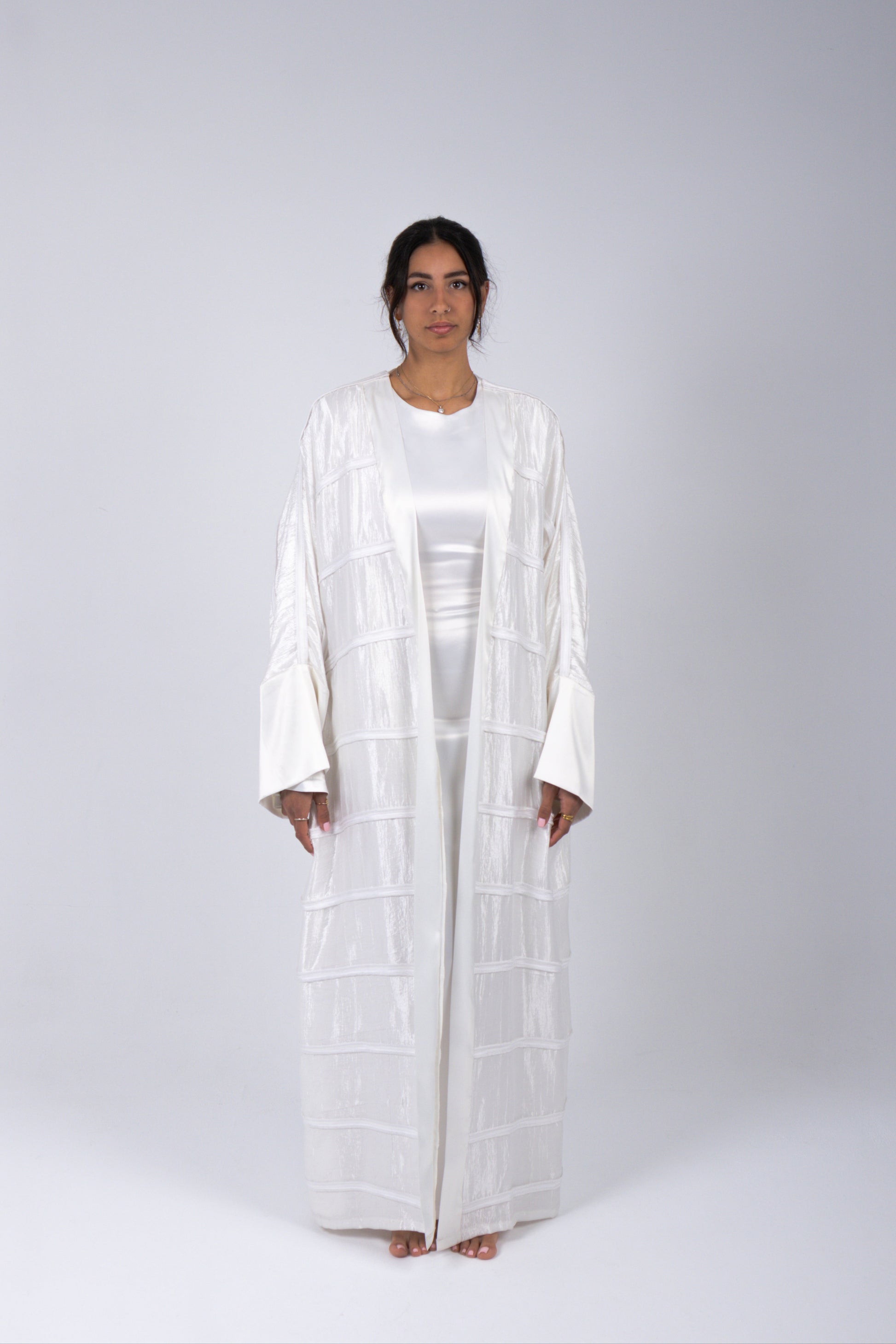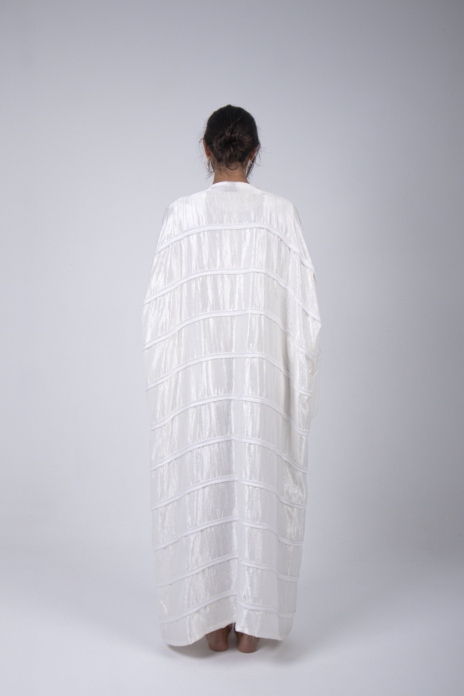 A stunning statement kaftan piece, with handmade thick satin-designed stripes. Cape cut sleeves with a clean satin border graceful finish. Not see-through, perfect for an elegant Ramadan fit.