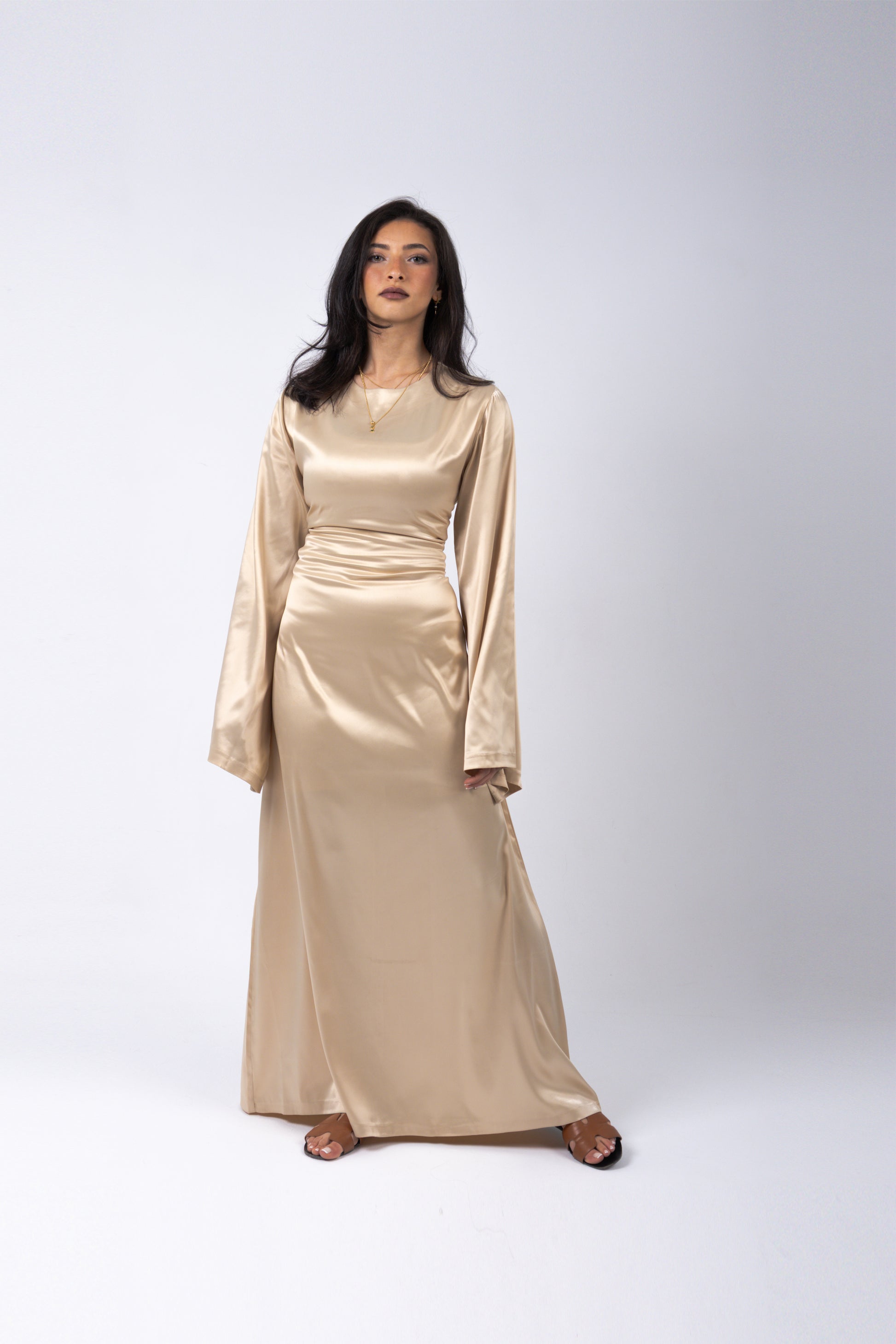 Champagne one-size-fits-all flattering dress, with long bell sleeves, corset belt tightened from the back, with back neck hidden zipper to secure. Slight u-neck shape around the collar, and the material is silky smooth satin, wear light colors under.
